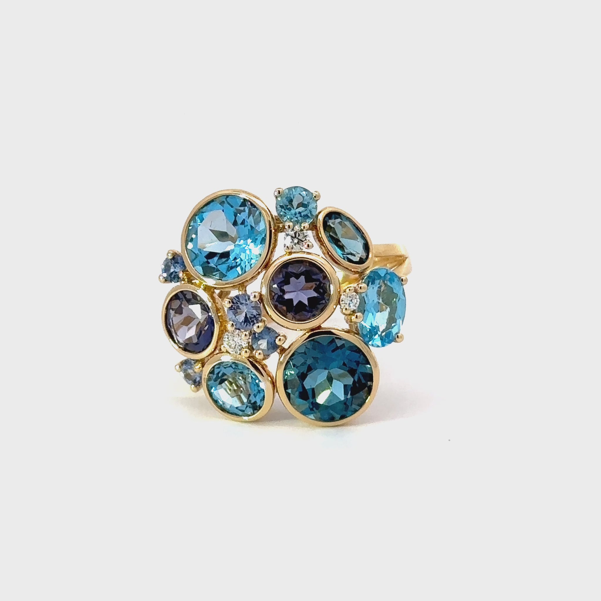 En el centro y a su alrededor brillan 2 topacios light blue de 2.00 ct en conjunto, acompañados por 4 topacios azules de 3.30 ct que evocan la profundidad del océano. Complementan esta sinfonía cromática 2 topacios redondos de 0.90 ct, aportando un toque de equilibrio y dinamismo.
