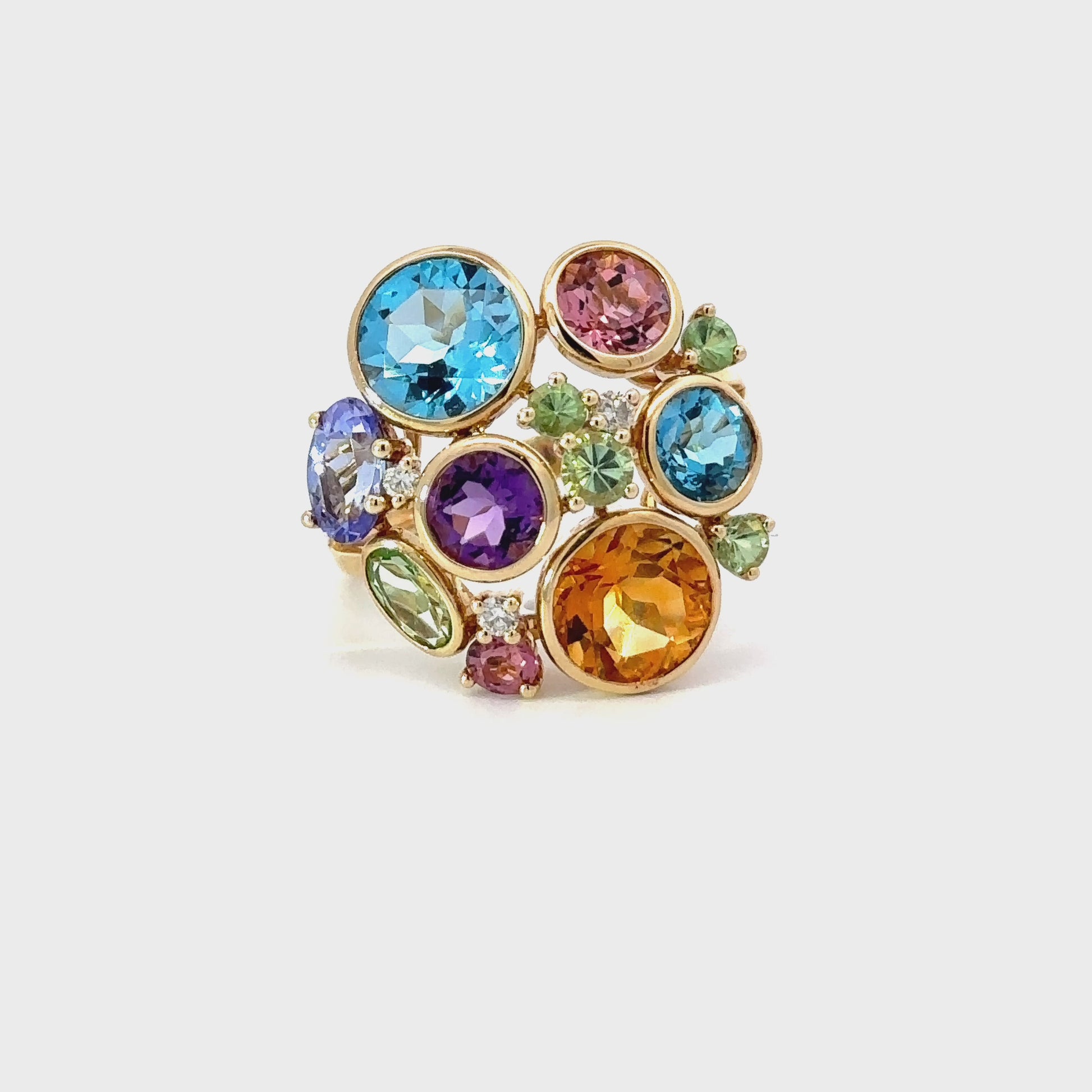 Un universo de color en una sola joya: el anillo Gaudí de oro amarillo 18 kt reúne una exquisita combinación de gemas naturales que llenan de luz y energía cada detalle.