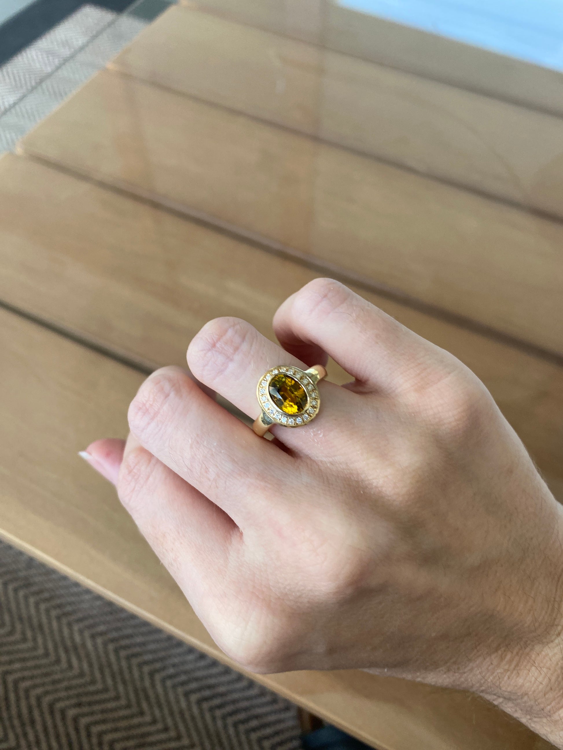 Magnífico anillo de oro amarillo Kenia de 18k con un zafiro central, sí, un zafiro amarillo natural de 2.36 ct, cuya intensidad de color y brillo parecen provenir de otro planeta. La gema, símbolo de luz y prosperidad, está rodeada por un delicado halo de 20 brillantes naturales que suman 0.14 ct, aportando un destello sutil y elegante que realza aún más la majestuosidad de la piedra central.