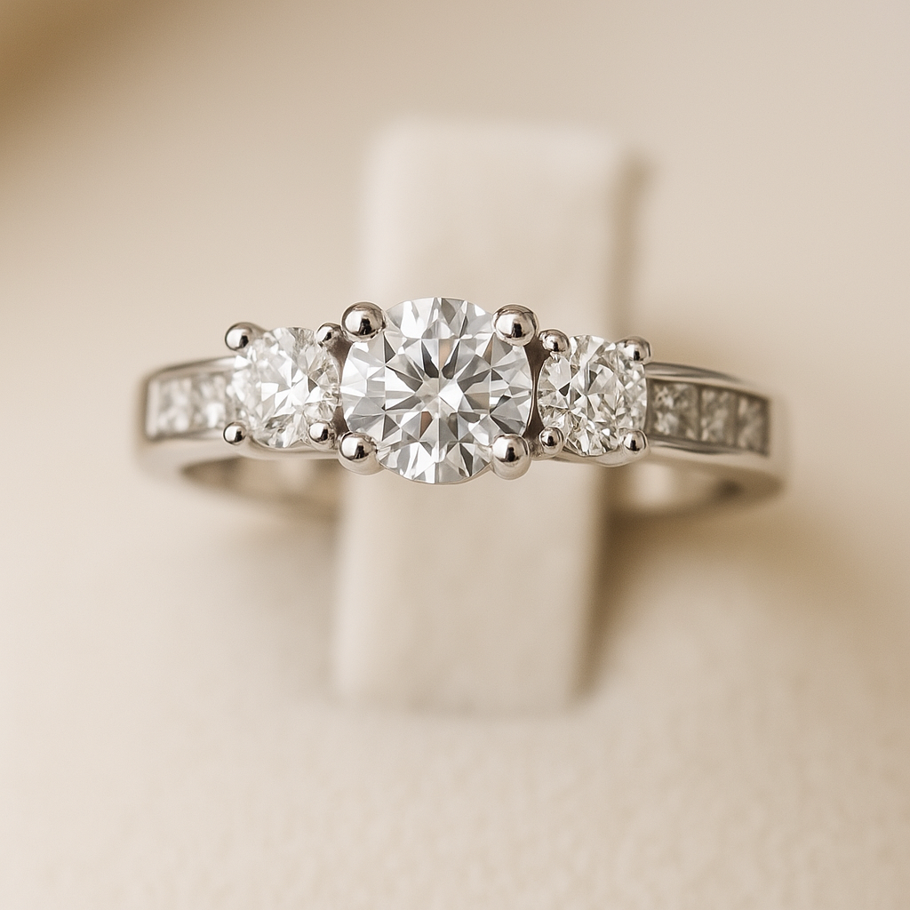 Anillo Tricillo con tres diamantes en el centro y cintillo de diamantes engastados en riel.