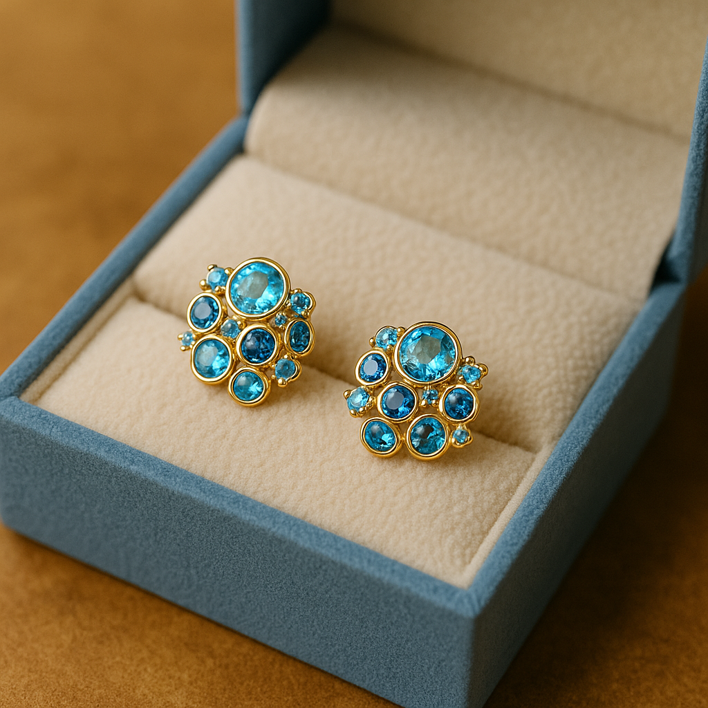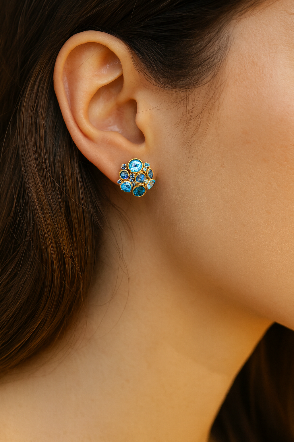 Impresionantes aros, presentan una variedad de gemas semi preciosas en tonos azules engastados en chatón.