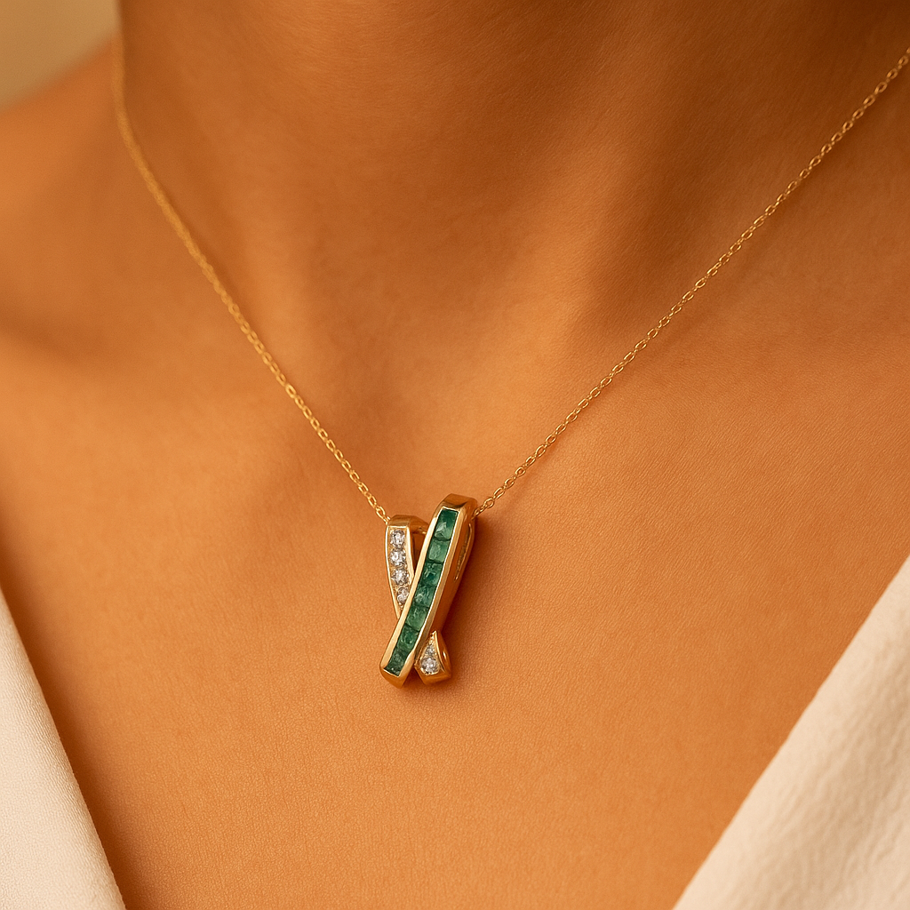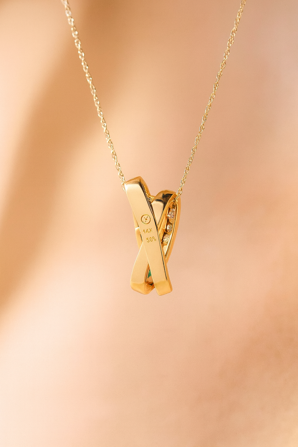 Este colgante de oro amarillo 14 kt cautiva con un diseño sofisticado y femenino donde dos delicadas líneas se entrelazan en armonía. Una de ellas resplandece con la intensidad verde de las esmeraldas naturales, mientras la otra brilla con la pureza de diamantes engastados con precisión, creando un contraste elegante y atemporal.