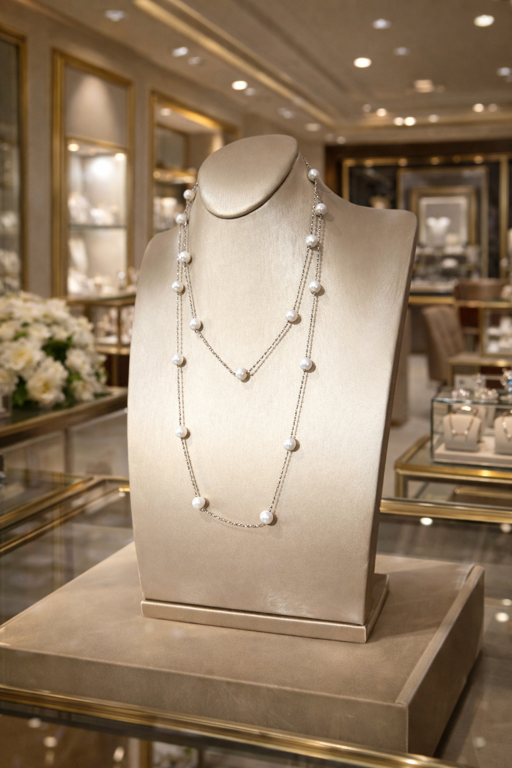 Su diseño evoca la sofisticación atemporal de la joyería europea, donde cada perla actúa como un punto de luz natural. La plata realza la pureza y el lustre de las perlas, logrando un equilibrio perfecto entre tradición y modernidad.