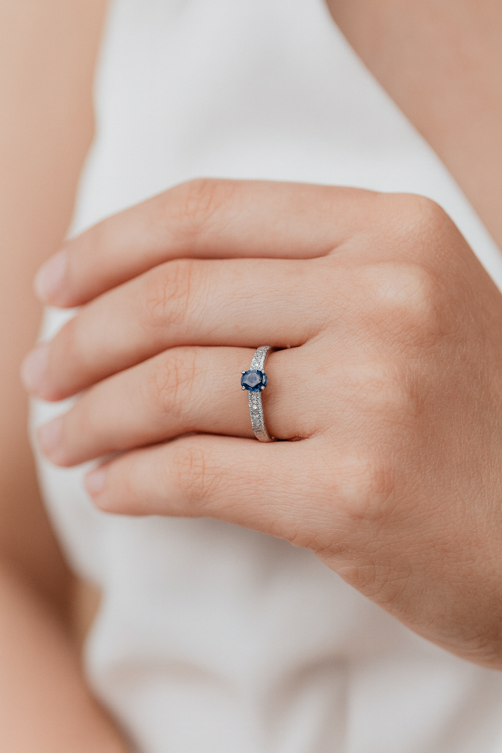 El anillo Madagascar de oro blanco 18k irradia sofisticación y delicadeza. Su diseño se centra en un zafiro natural de 0,54 ct, de un azul intenso y vibrante, símbolo de sabiduría y lealtad eterna. Acompañando a la gema central, 16 brillantes naturales que suman 0,06 ct se despliegan con sutileza en el aro, creando un juego de destellos que realzan la luminosidad del zafiro sin restarle protagonismo.