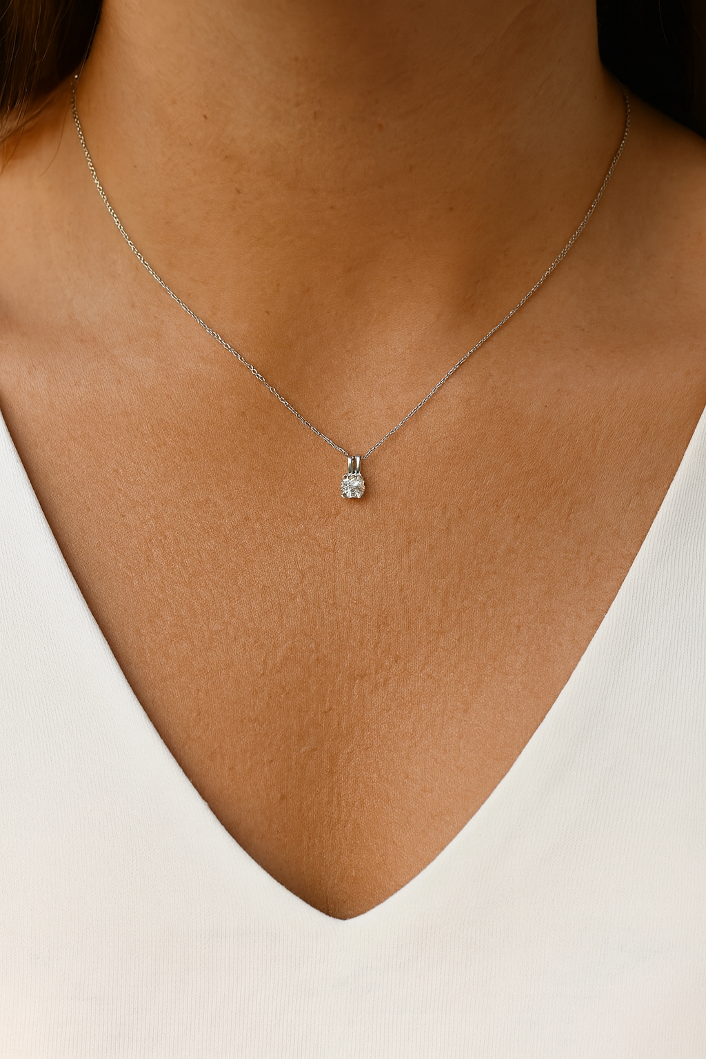 Un destello de luz eterna en su forma más pura. Este delicado colgante punto de luz está protagonizado por un diamante natural de 0,33 ct, tallado en brillante redondo y engastado con precisión en oro amarillo sólido de 14 quilates. La montura de cuatro grifas resalta la transparencia y el fuego interno de la gema, permitiendo que cada faceta refleje la luz con intensidad.
