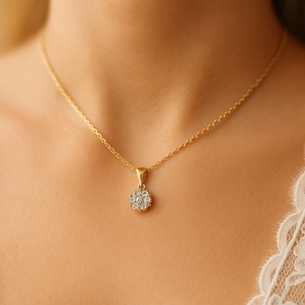 Los diamantes están engastados en oro amarillo sólido de 14 kt, con un trabajo de precisión que garantiza seguridad y durabilidad, al mismo tiempo que aporta un acabado pulido y elegante. Con un peso total de 0,82 gramos, este colgante se percibe ligero y cómodo, perfecto para lucirlo en ocasiones especiales o incorporarlo como un detalle cotidiano de lujo discreto.