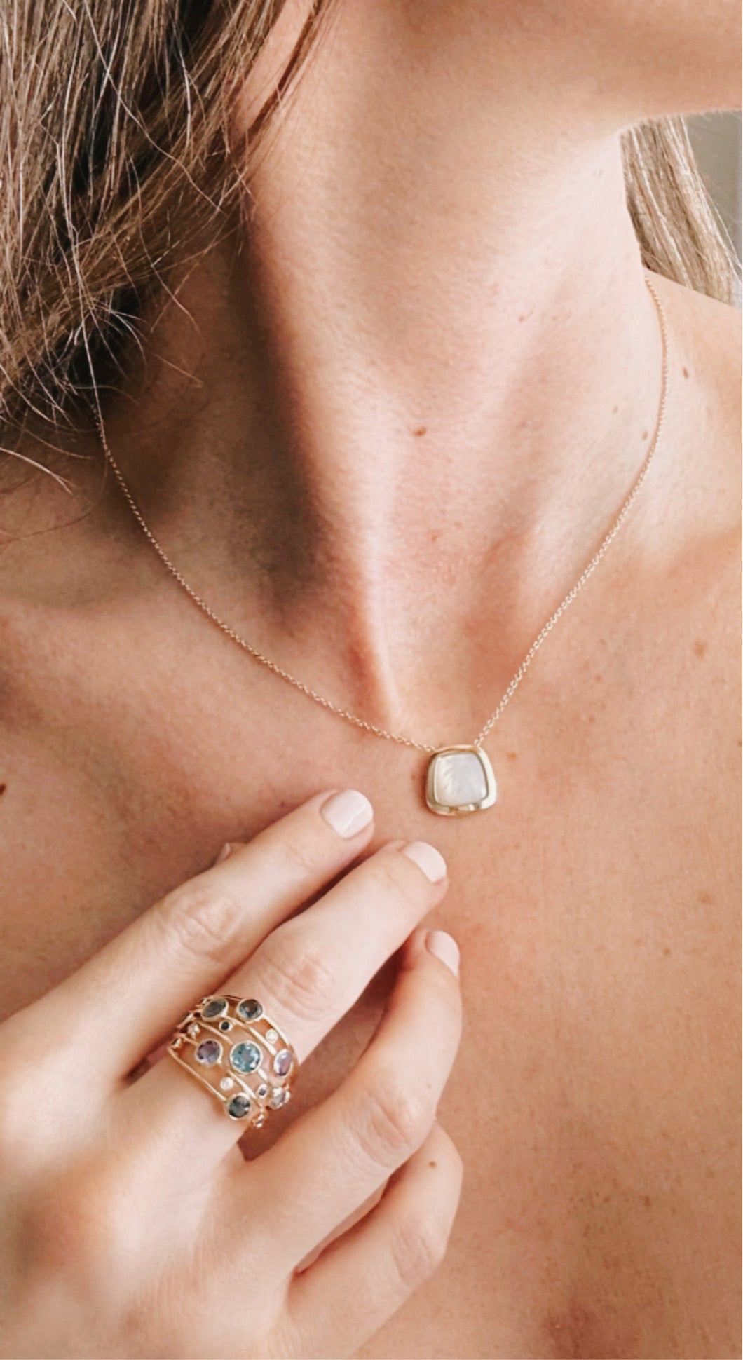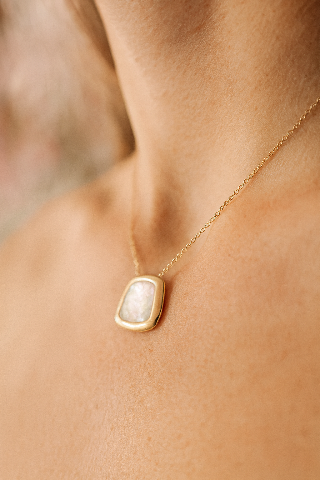 Este delicado colgante de oro amarillo 14 kt combina el brillo cálido del oro con la suavidad luminosa del nácar (madreperla), una piedra conocida por su elegancia natural y su sutil juego de reflejos. Con un largo de 15 mm, su diseño sencillo y refinado lo convierte en una joya versátil, ideal tanto para uso diario como para ocasiones especiales.